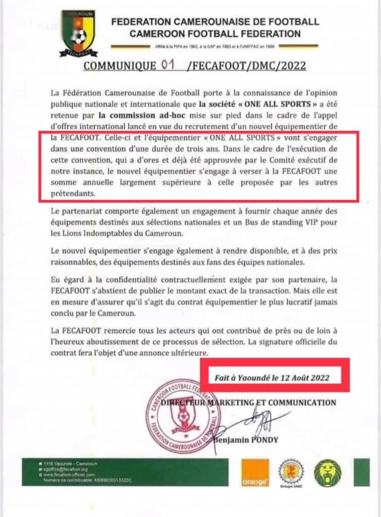 En effet, dans un communiqué signé le 12 août 2022 par le secrétaire général par intérim de l’instance du football camerounais informait l’opinion que la Fécafoot « et l’équipementier One All Sport vont s’engager dans une convention d’une durée de trois ans ». Une information qui tombait donc trois jours après que Samuel Eto’o aurait signé ledit contrat. Bizarre non ?