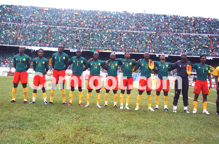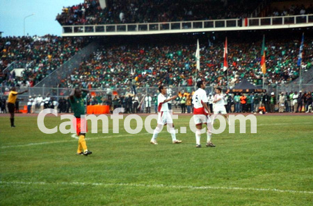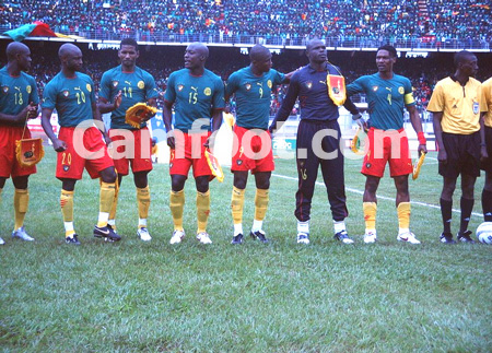 Cameroun : 16-Souleymanou Hamidou,6-Angbwa Benoît (puis 13-Feutchine Guy) 4-Song Rigobert (cap), -Kalla Raymond, 3-Wome Pierre,14-Saidou Alioum, 21-Makoun Jean (puis 10-Ngom Kome 88ème), 20-Olembe Salomon, 15-Webo Achille, 18-Douala Rodolphe (puis 11-Ndiefi Puis), 9-Eto’o Fils Samuel,