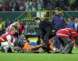 (1) fil info camfoot. Coup de tonnerre ce soir à Brême. A l’heure de jeu, sur une action somme toute banale, Samuel Eto’o s’effondre en se tenant le genou. Remplacé par Gudjohnsen, le meilleur buteur de la Liga a été pris immédiatement en charge par le service médical. Le staff évoque une rupture du ménisque externe, ce qui ferait une indisponibilité de deux ou trois mois. Une mauvaise nouvelle pour le Camerounais en course pour le Ballon d’Or France Football. Une chose est certaine, il manquera la rencontre contre la Guinée Equatoriale le 8 octobre prochain.