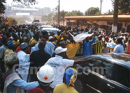 Les populations ont fini par se ruer sur le cortège. Qui s’agrandit davantage ici. Des taximen, des bendskineurs ( conducteurs de motos) et autres particuliers intègrent les rangs. Les vitesses sont diverses. Chacun y va de sa fantaisie, pour marquer sa joie. Quelques blessés sont enregistrés. Et l’on recourra au pick-up d’une entreprise brassicole pour transporter une moto bousillée par le goudron.