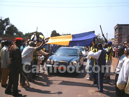 Après Tayandji, l’entrée à Foumban, la capitale départementale du Noun est amorcée vers 14 heures. Les populations sont omniprésentes, et ne laissent plus les véhicules du cortège se mouvoir. « Fédéral irérréééé!!! », chante-t-on, à tue-tête. Arrêt obligé. L’on peut apercevoir Alassane Fouapong, le sous-préfet de Bafoussam et élite du coin réguler la circulation, finalement bloquée.