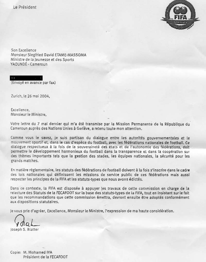 Mis au courant de la nouvelle, Sepp Blatter aurait alors précipité l’écriture de sa lettre de réponse à une communication que lui avait préalablement adressé le ministre camerounais. Vu l’urgence de la situation, cette réponse n’a pas suivi les canaux normaux d’expédition de courriers de la FIFA, comme le mentionne l’expression « envoyé en avance par fax » incluse dans l’entête de la lettre.
