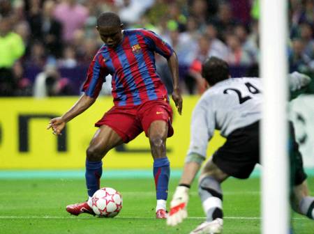 Sur une nouvelle pichenette de Ronaldinho, Eto’o se défaisait du marquage de Campbell, frappait une pointe du gauche, que le gardien remplaçant d’Arsenal dégageait sur son montant droit (45+2).
