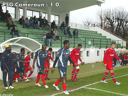 En fin de première période, la reprise de volée de Saidou (33e) et la bicyclette de Webo (37e) ne trouvent pas le cadre. Les deux équipes regagnent les vestiaires sur ce score de 0-0. Les deux entraîneurs font alors tourner leur effectif à la pause. Alonzo remplace Letizi dans les buts parisiens, alors que côté camerounais Souleymanou et Emana laissent leur place à Kameni et Song.