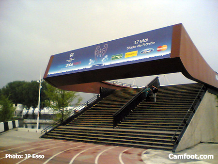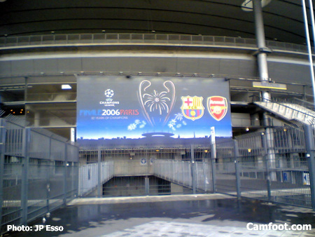 Samedi 13 Mai, 16H. Quelques ouvriers s’activent pour achever de décorer le stade de France, qui accueille ce mercredi la finale de la Ligue de Champions 2006. Barcelone-Arsenal est le match qui clôture la saison européenne, en attendant la coupe du monde. La rencontre se jouera à guichets fermés, les 77 500 places ayant été vendues.
