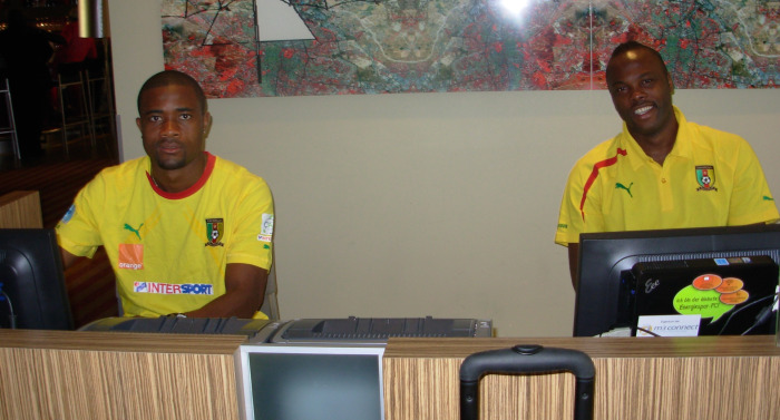 Aurelien Chedjou et Stéphane Bikey dans le hall de l'hôtel