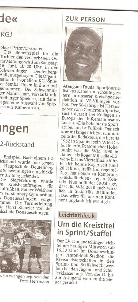 Après le Congrès, pendant que le président Emmanuel Gustave Samnick rentrait au Cameroun, le Vice-président Atangana Fouda est allé en Allemagne, pris en totale charge pendant 5 jours par Stephen Sunou de camfoot.com, membre de l’AJSC, avec qui ils ont fait le tour des rédactions sportives de quelques quotidiens régionaux. L’accueil a été très chaleureux et les entretiens sur les possibilités de partenariat avec l’AJSC et d’aide en matériel de travail (ordinateurs portables, appareils photos numériques, clés USB, etc) à la presse sportive camerounaise ont abouti à des promesses. L’un de ces quotidiens a d’ailleurs consacré une brève avec photo sur cette visite.