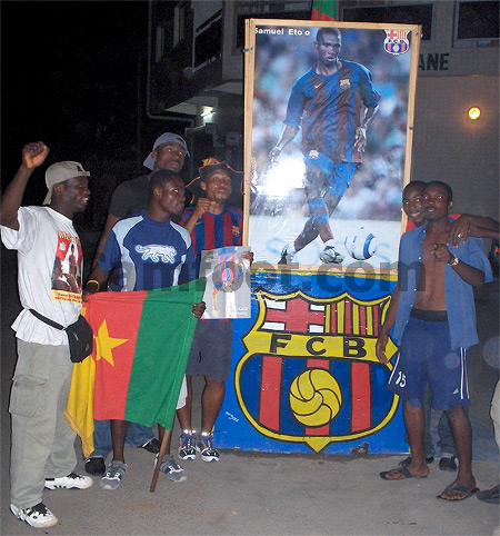 17 mai 2006. Au lieu dit ‘’parlement 9 ‘’, à New Bell, le quartier d’enfance de Samuel Eto’o à Douala, le visiteur a l’impression de se retrouver dans les gradins du Stade de France. Debout sous des bâches géantes installées pour la circonstance, une centaine de supporters de l’attaquant camerounais du Fc Barcelone, les bras en l’air en forme de V, dansent sous un air de musique locale interprétée par un orchestre de la place. D’autres fans brandissent des cassiers de bières vides.
