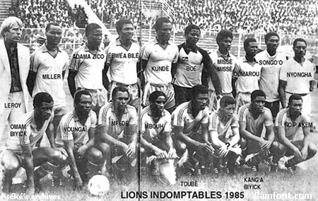 Nuit paisible et fraîche et lendemain tranquille. La direction est descendue nous chercher un petit déjeuner complet croissants au beurre (T-Bella Oyé !), crêpes et fruits… mais avant, décrassage sans problèmes… Après la bouffe réunion d’avant match puis défilé de tout ce que compte Union comme gros bonnets. Les primes pleuvent et après compilation, les sommes sonnent : 400 000 FCFA pour ceux qui auront foulé la pelouse et 250 000 FCFA pour les réservistes en cas de victoire. Les sourires se font larges sur les visages. Pour blaguer, Ngondiep met une cassette de l’oncle Otsama décrivant le match de Nya’Misoul FC.. On est morts de rire en parlant des Ma Lolo et autres mbianyak… 11 h 30, repas sacré et surtout tombée des équipement tout neufs… Le tract fait son entrée avec les maillots mais l’appétit est bon. Petite sieste et re-réunion au cours de laquelle Abong va donner sa liste des 16. Au courant, Yon me souffle « Ou nTòk »…(tu joues en basa’a). Mon sang vire !