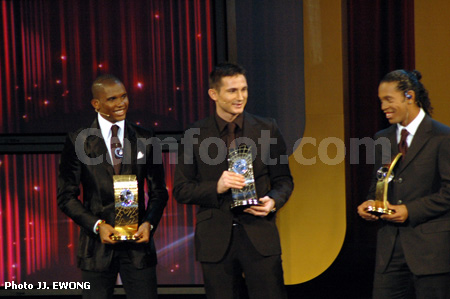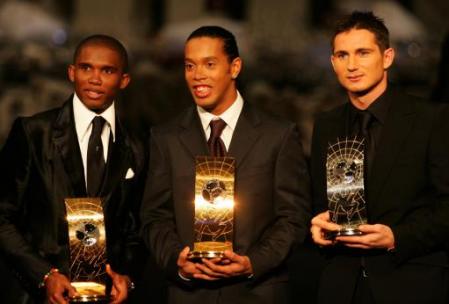 – L’ambrassade Eto’o/Ronaldinho à la remise des récompenses est l’image de la parfaite symbiose dans la paire d’attaque la plus dangeureuse du monde. Et, contrairement aux affirmations d’une certaine presse francaise, le « 9 » et Ronnie sont 2 joueurs qui s’apprécient et se respectent mutuellement.Eto’o ne s’est exprimé d’ailleurs qu’en espagnol aux collègues de la presse francaise.