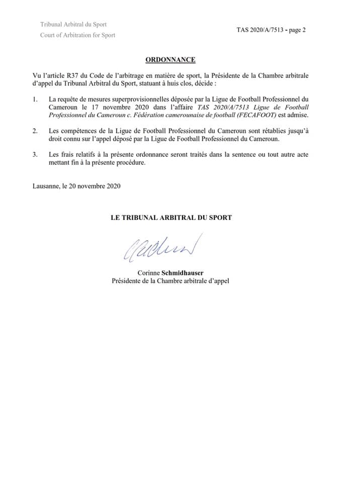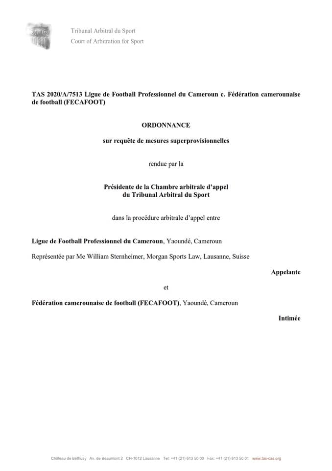 Le TAS suspend la décision prise par la FECAFOOT de retirer à la Ligue de Football Professionnel du Cameroun (LFPC) l’organisation des championnats de football professionnel.