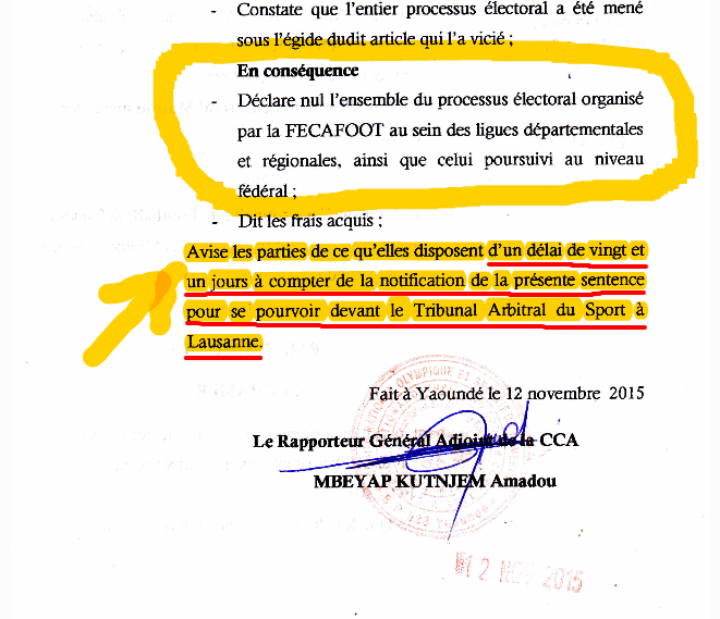 Sur l’appel qui a été rejeté par le TAS « Au départ, quand nous sommes allés à la CCA (Chambre de conciliation et d’arbitrage du Cnosc, Ndlr.), nous avions demandé deux choses : qu’elle constate que les élections de la Fécafoot se sont tenues sur la base des Statuts qui étaient contraire à la loi camerounaise et qu’en conséquence annuler ce processus. Ensuite, elle devait, après avoir annulé le processus électoral, préciser que c’est le Comité exécutif de la Fécafoot élu le 24 mai 2009 avec à sa tête monsieur Begheni Ndeh en l’absence de monsieur Iya, qui doit assurer l’intérim, élaborer de nouveaux statuts, les faire adopter et organiser un nouveau processus électoral. Et le 12 novembre 2015, la CCA a effectivement annulé l’ensemble du processus électoral, mais a gardé le silence sur notre deuxième demande sur l’intérim au sein de la Fécafoot. Nous avons donc attaqué cette décision devant le TAS (Tribunal arbitral du sport, Ndlr.), en disant qu’on est content que le processus électoral soit annulé, mais par contre, la CCA n’a pas dit que c’est le Comité exécutif de 2009 qui doit assurer l’intérim. Voilà pourquoi nous sommes allés au TAS. Ce n’était plus sur les questions liées aux élections. Puisque, depuis le 10 décembre 2015, l’annulation du processus électoral était devenue définitive ». Sur les raisons de la longue procédure « La procédure a duré 12 mois, parce qu’il y a eu au départ une erreur de jugement d’un Conseiller au niveau du TAS, et cette erreur de jugement a fait que sur la base d’un avis de la FIFA, il a reconnu à monsieur Tombi la possibilité de mandater des avocats. Finalement, ç’a tourné à notre avantage. C’est grâce à cette erreur que nous avons aujourd’hui la possibilité d’aller devant le tribunal fédéral suisse ». Pourquoi aller devant le tribunal fédéral suisse « Dans cette sentence, le TAS dit que nous l’avons saisi tard parce que le délai c’est 20 jours après la notification, et non 21 jours. C’est le premier point du dispositif. Pourtant, sur la décision qui nous a été servie le 12 novembre 2015 par la CCA, il est écrit que le délai d’appel est de 21 jours. Le Code même de la CCA prévoit que le délai d’appel de ses décisions est de 21 jours. Le TAS a écrit au président du Cnosc pour lui demander qu’au fait, quel est le délai d’appel ? Le président Kalkaba a répondu que c’est 21 jours. Mais l’arbitre est allé chercher un délai de 20 jours, dans les statuts du Cnosc adoptés en 2005. Et il a donc rejeté l’appel concernant la réintégration du Comité exécutif de 2009 à la Fécafoot en disant qu’il ne peut par conséquent pas modifier la décision rendue par la CCA le 12 novembre 2015. Je ne sais pas ce qu’il se passe, mais nous avons discuté avec nos avocats. Nous estimons que le juge en retenant le délai d’appel de 20 jours n’a pas voulu connaitre l’affaire de la réintégration du Comité exécutif de 2009, au fond. Nous allons à présent devant le tribunal fédéral (suisse) pour faire constater que le délai d’appel a été respecté afin que celui-ci renvoie cette affaire devant le TAS pour que le TAS entre en matière (…) Je n’ai pas besoin d’aller devant un tribunal ici. La Fifa est en Suisse, et elle est tenue d’appliquer et de faire appliquer les effets de cette confirmation (…) Nous allons démontrer que le TAS s’est trompé. Nous pouvons casser cette décision et refaire dire au TAS que c’est le Comité exécutif de 2009 qui doit assurer l’intérim à la Fédération ». Repris par Arthur Wandji