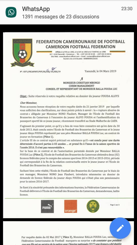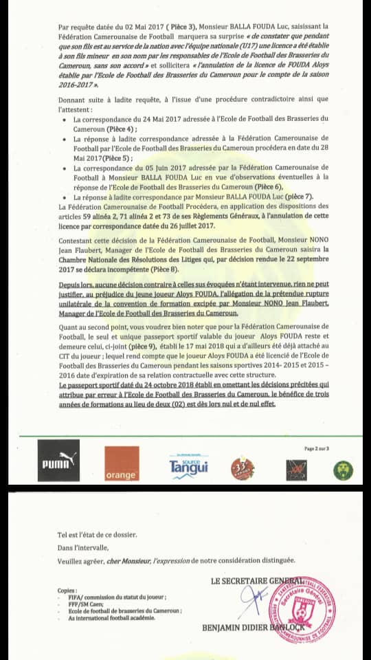 La fédération camerounaise de football a tranché après avoir menée une enquête exhaustive sur l’affaire de fausse signature et de fabrication d’un avenant au contrat du jeune joueur Aloys Fouda par le Manager Général de l’École des Brasseries du Cameroun. De la plume de son Secrétaire Général, l’instance valide le passeport du joueur signé le 27 mai 2018 et qui a permis à Fouda de finaliser son transfert pour le Stade Malherbe de Caen.