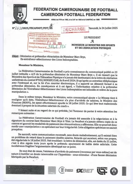 La Fédération camerounaise de Football n’a jamais été associée à la négociation et à la signature du contrat liant Monsieur Marc Brys à l’Etat. La Fécafoot n’a jamais obtenu copie de ce contrat et ignorait les modalités de paiement des rémunérations y afférentes. Elle ne pourrait donc ourdir une « manipulation» en spéculant sur leur irrégularité. Cette allégation spécieuse ne saurait prospérer. De surcroît, votre communication reconnaît, sans doute maladroitement, qu’il existait bien un problème de retard dans le paiement desdits salaires. Retards qui auraient, selon vos propos, été régularisés le 18 juillet 2025. Fait troublant : la lettre de démission, elle, est datée du 21 juillet, c’est-à-dire signée trois jours après le prétendu apurement de ladite dette salariale. Cette incohérence fragilise l’argumentaire développé sur ce point.