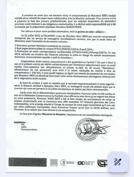 En tout état de cause, l’existence d’arriérés de paiement (reconnus par vous-même) est de nature à instiller un doute raisonnable sur l’hypothèse – sous-entendue – d’une fausse démission fabriquée par la Fecafoot […] Après avoir fait la démonstration qu’aucune manipulation d’aucune sorte n’a été ourdie au sein de la Fédération Camerounaise de Football, nous affirmons avec force qu’au regard des pièces en notre possession, Monsieur MARC BRYS a bel et bien rompu, en connaissance de cause, sa relation contractuelle avec le Cameroun avec effet immédiat ». Les documents reçus, par courrier recommandé, par la Fédération Camerounaise de Football (FECAFOOT) pour justifier la résiliation de Marc Brys :