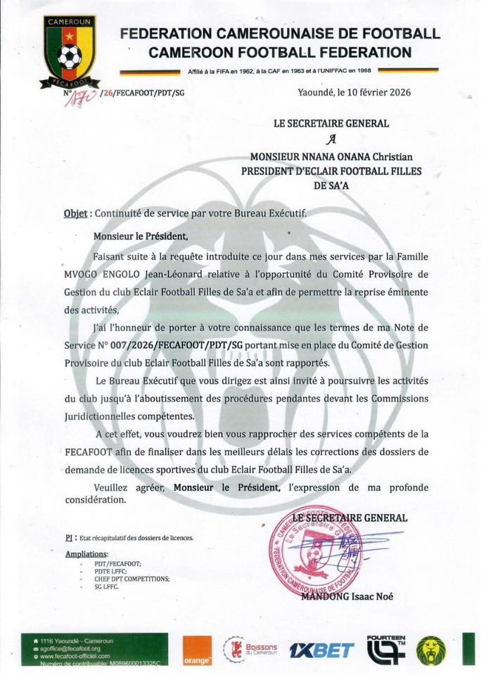Christian Onana reprend les commandes d’Eclair Football Filles de Sa’a. C’est la quintessence d’une correspondance du secrétaire général de la Fécafoot datée du 10 février. Nlaise Noé Mandong invite l’intéressé à se rapprocher de l’instance pour apporter des correctifs aux dossiers en vue de l’obtention des licences. En effet, cette demande arrive après le pressing haut du président Christian Onana. En effet, ce dernier avait saisi les juridictions pour dénoncer certaines pratiques jugées illégales dans ce dossier.