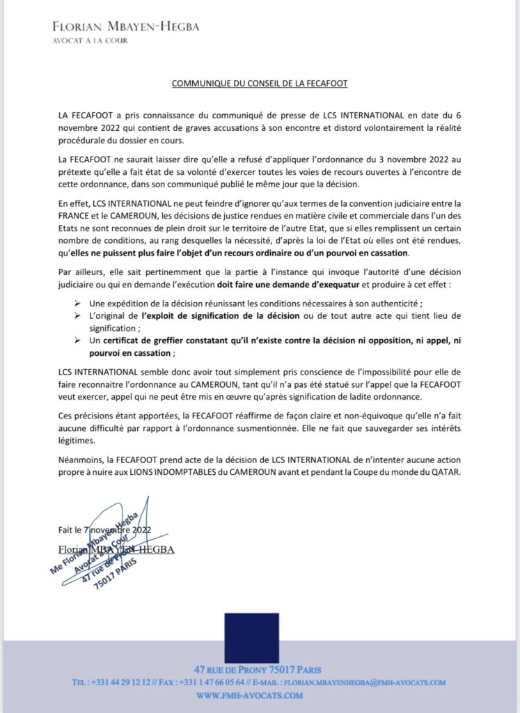 Le Conseil de la Fédération camerounaise de football a réagi au communiqué de Le Coq Sportif publié lundi dernier dans lequel il déplore le refus de l’autre partie d’appliquer l’ordonnance en référé du tribunal de Paris.