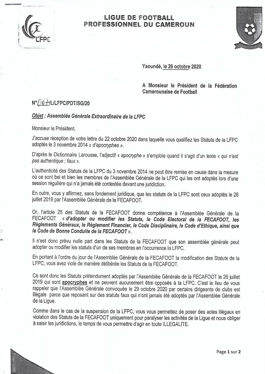 C’est en quelque sorte l’objet du courrier envoyé par le Président de la Ligue de Football Professionnel du Cameroun au Président de la Fédération ce lundi. Il le prévient de son intention de se battre avec tous les moyens légaux à sa disposition pour protéger la Ligue.