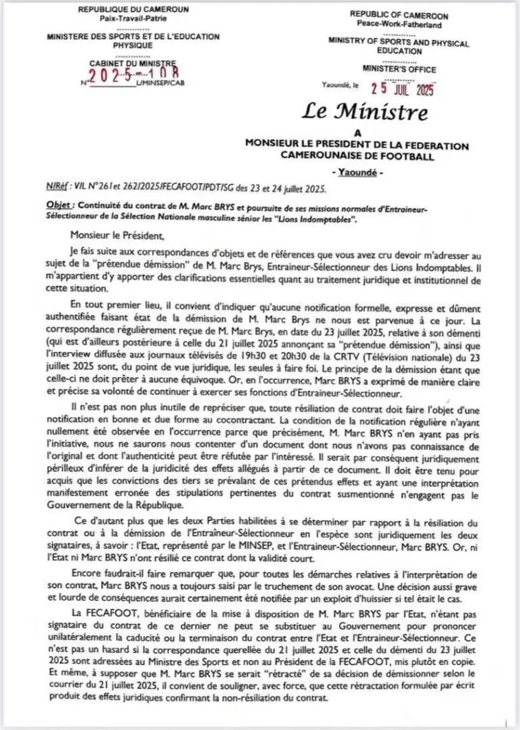 Extrait de la note du Ministre des Sports et de l’Education physique adressée au président Samuel Eto’o Fils