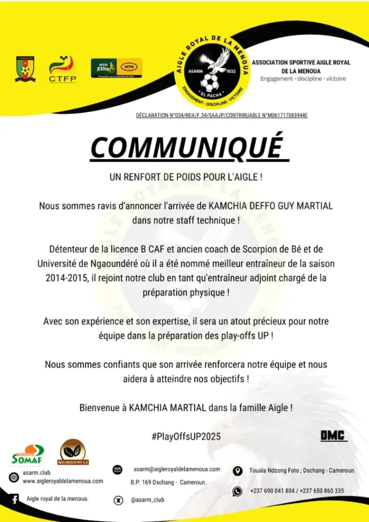 Guy Kamchia Deffo intègre le staff technique de l’Aigle royal de la Menoua. Le nouveau préparateur physique remplace Denis Mahouli désormais au Canon sportif de Yaoundé. Il va donc aider l’entraineur Serge Emaleu à préparer les joueurs pour des Play-offs sans fausse note. Car l’objectif principal de l’Aigle royal de la Menoua est de remonter en Elite One à la fin de ce mini-tournoi.
