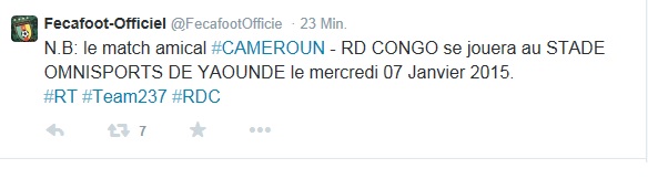 Contrairement au programme initial, le match amical Cameroun – RDC se jouera au stade omnisports de Yaoundé.
