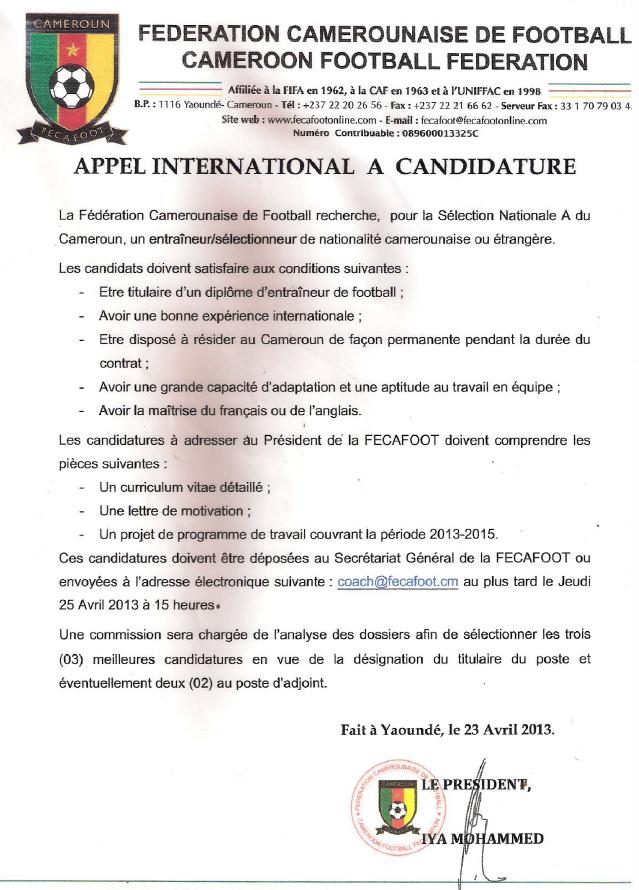 Suite aux instructions du Ministre des Sports et de l’Education Physique pour le recrutement d’un entraineur sélectionneur pour les Lions Indomptables, la Fécafoot par la voix de son président a lancé un appel à candidature.