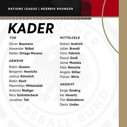 L’Allemagne mène la course en tête dans le groupe C de la Ligue des nations européennes. Avec trois victoires et un match nul, la ‘’nationalmannschaft” est déjà qualifiée pour les quarts de finale avec 10 points au compteur. Car Julian Nagelsmann veut conserver cette position lors de cette fenêtre internationale. En effet, le sélectionneur vient de publier sa liste de 23 joueurs pour la 5e et 6e journée respectivement contre la Bosnie-Herzégovine (16 novembre) et la Hongrie (19 novembre). En réalité, ces deux rencontres vont lui permettre de roder son effectif. Le défenseur de l’Inter Milan, Yann Aurel Bisseck, ne sera pas de cette expédition. Le natif de Köln n’a pas été convoqué.