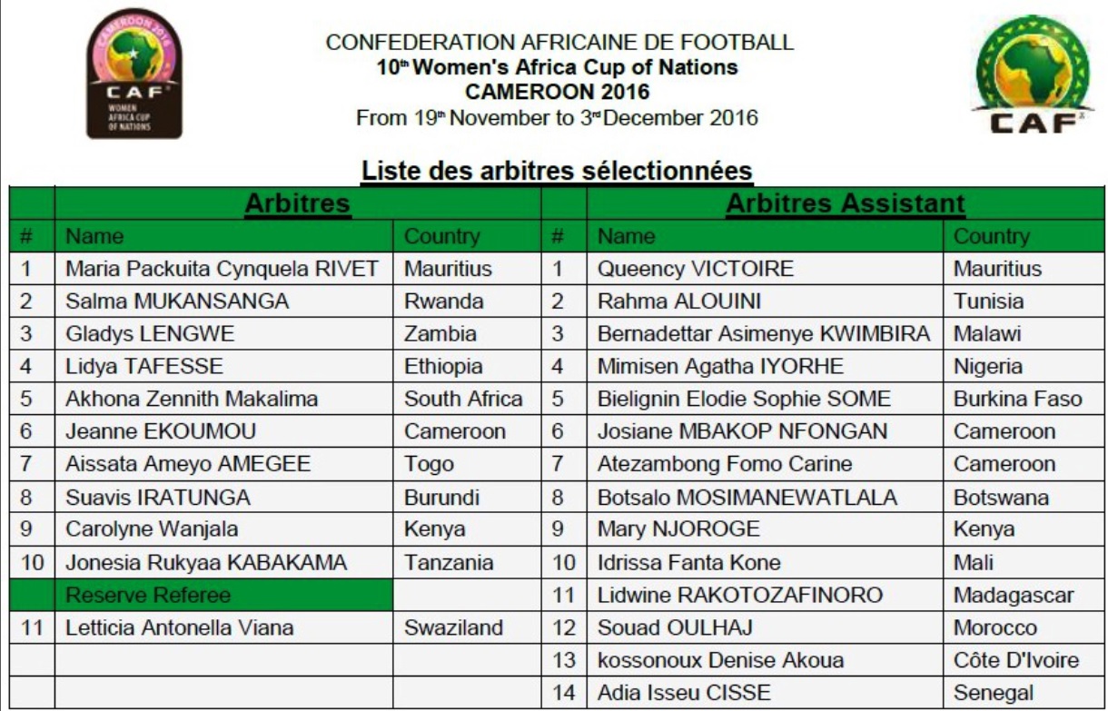 11 arbitres et 14 arbitres-assistants ont été désignés pour diriger la 10e CAN féminine, Cameroun 2016 qui va se dérouler du 19 novembre au 3 décembre, à Yaoundé et à Limbé. Le Cameroun se taille la part du lion avec une arbitre et deux assistantes.