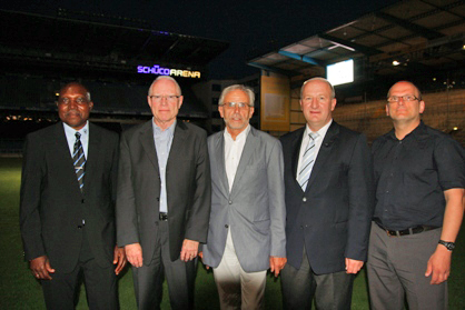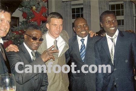 En 2007, le natif de Bangou (Ouest Cameroun) était porté à la tête du centre de formation de Bielefeld. Une récompense qui couronnait déjà sa longue carrière de formateur en Bundesliga. David Odonkor, Lukas Podolski, Patrick Owomoyela, Marcel Ndjeng, Sahr Senesie, Otto Addo, Arne Friedrich, Thomas Helmer, Massimilian Porcello ou encore Anthony Baffoe sont quelques noms du large répertoire constitué de footballeurs passés sous ses ordres.Le conseil de surveillance de BielefeldDe Bangou à Bielefeld en passant par Paris C’est dans la fin des années 60 qu’il commence sa carrière dans Espoir de Bangou qui est une équipe locale. Au début des années 70, il va rejoindre le Racing de Bafoussam où 7 membres de sa famille sont déjà passés. Même s’il n’est pas un « grand » aux côtés des Mayaka, Simo Benjamin ou encore des Nono « dragon », il représente quand même la jeunesse du TPO (Tout puissant de l’Ouest). C’est dans le stade de Douala (deuxième division du littoral) que sa carrière va prendre son envol. Il participe montée en première division avant de rejoindre la France en 1974. Un exil européen qui n’aura rien de sportif puisque le jeune Kwamo est envoyé (sous l’impulsion de son oncle, qui était tailleur) par sa famille poursuivre ses études sur le vieux continent. C’est à l’académie internationale de coupe de Paris que l’ancien pensionnaire d’espoir de Bangou dépose ses valises et en ressort avec un diplôme de styliste modéliste.Augustin Kwamo et Marcel Ndjeng Il travaille dès sa sortie d’école chez Yves Saint-Laurent et avec d’autres Africains de la branche tels que Djeumani. Ce qui ne l’empêche pas de continuer sa passion qu’est le football. C’est étant dans la formation de Quimper (nord de la France) que Nzoudja Claude (ancien président du Diamant de Yaoundé) gardien de but à Berlin lui propose de traverser le Ruhr. Une proposition qui ne le laissera pas indifférent. En effet, Augustin Kwamo-Kamdem entretien une liaison amoureuse avec une jeune étudiante Allemande venue étudier la littérature Française à Paris. Même s’il entrevoit de retourner au Cameroun vivre avec sa dulcinée, c’est finalement en RFA, plus précisément dans la région de Bielefeld qu’il va définitivement poser ses valises en 1980. À son arrivée, il se sent bien accueilli dans une région où on ne trouve pas d’Africain. Il intègre rapidement l’équipe amateur du DC Arminia Bielefeld qu’il ne quittera plus.Entouré par Sahr Senesie et Lukas Podolski C’est à la naissance de son premier fils (actuellement commissaire de police) qu’il décide d’arrêter de jouer au foot pour se consacrer à l’éducation de son enfant. Sa compagne n’ayant pas encore terminé ses études, il devenait pratiquement impossible pour lui de continuer sa passion. C’est en jouant avec son fils que sa carrière d’entraîneur va commencer. En effet, les autres enfants du quartier viennent se joindre à lui pour s’exercer à taper dans le cuir. C’est à ce moment que la direction du club lui confie l’encadrement des plus jeunes. Avant son élection dans le conseil de surveillance du club, Augustin était à la tête du centre de formation. Bien qu’installé depuis 30 ans en Allemagne, il garde toujours des bonnes relations avec ses anciens coéquipiers. Kaham Michel (entraîneur formateur à la KSA), Simo Paulin (pharmacien à Loum), Roger Milla, Thomas Nkono et Joseph Antoine Bell ont ainsi gardé un contact permanent avec Augustin Kwamo. Stephen SunouSes premières déclarations (en Allemand, ndlar)