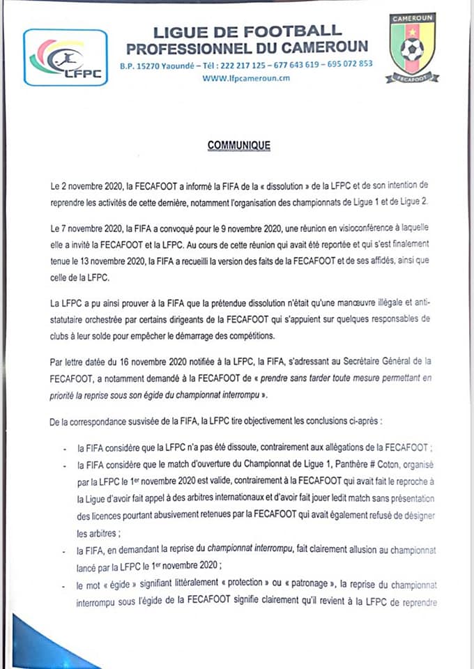 La Ligue a été bien plus explicite dans sa correspondance aux médias. Et puisque la FIFA estime que le championnat allait se poursuivre, elle estime que c’est bien elle qui a reçu l’onction.