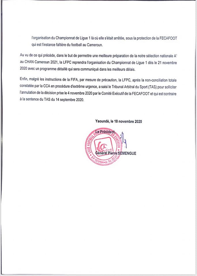 Pierre Semengué a eu la main heureuse en convaincant Abdouraman Hamadou d’être son principal stratège. Alors que la Fecafoot indiquait son refus de coopération en attendant l’éclairage de la FIFA, la dernière balle du Sheriff est venue de Lausanne puisque le Tribunal Arbitral des Sports a décidé en urgence d’annuler la décision du retrait d’agrément servi par la Fécafoot à la Ligue.