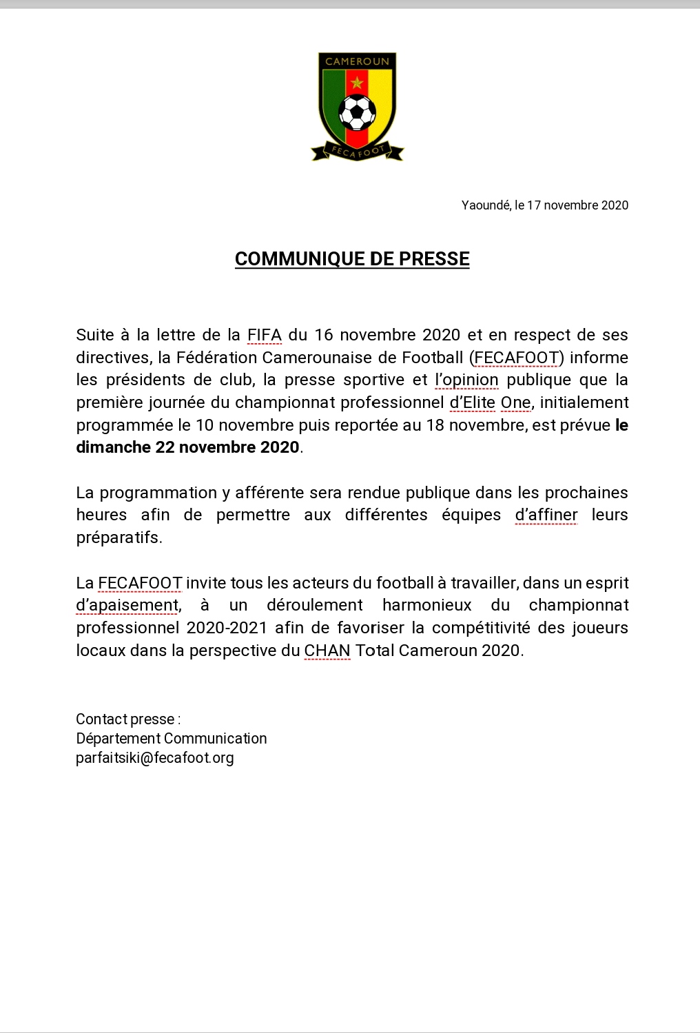 La Fécafoot a donc planifié le lancement de sa saison le dimanche 22 novembre avec la certitude d’avoir obtenu l’aval de la FIFA.