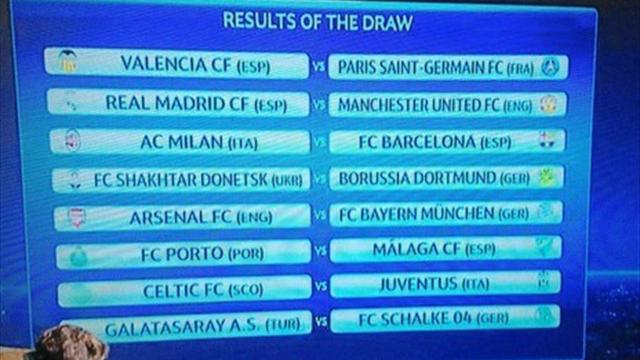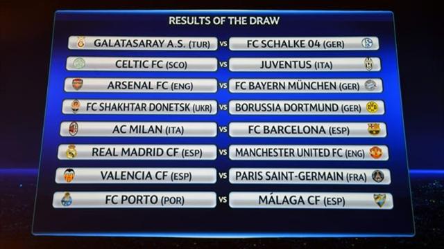 Le tirage est partiellement dirigé, puisque deux clubs du même pays ne peuvent pas s’affronter, pas plus que deux équipes qui étaient dans le même groupe au premier tour, ce qui limite l’éventail des possibilités. La probabilité que les huit mêmes matches Real Madrid-Manchester United, AC Milan-Barcelone, Arsenal-Bayern Munich, Valence-Paris SG, Galatasaray-Schalke 04, Celtic Glasgow-Juventus et Shakhtar Donetsk-Dortmund et FC Porto-Malaga, sortent deux fois d’affilée était néanmoins extrêmement faible.