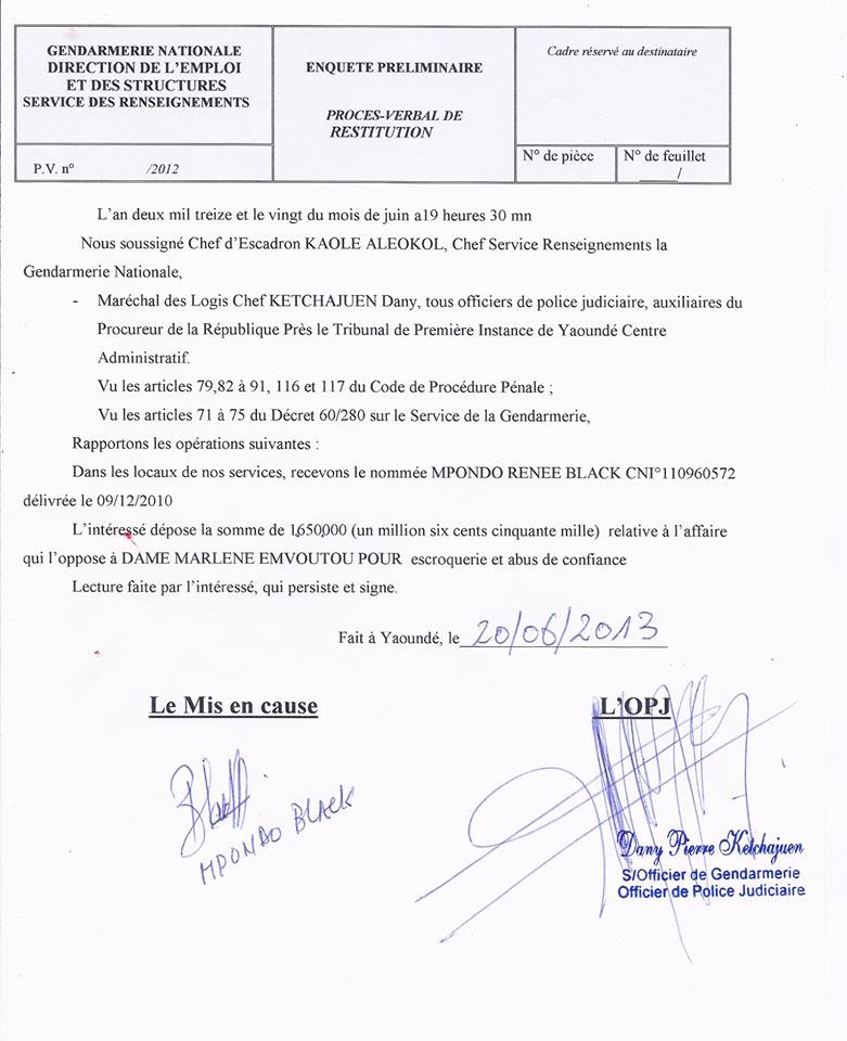 juste pour vous apprendre que jusqu’à a ce jour la fecafoot n’a pu payer les frais de missions des délégués. Ceux ci ont trouvé un moyen plus intelligent, ils sont venus me voir pour me proposer d’être leur tète de liste contre des sommes énormes. Voici la décharge du délégué du littoral interpelé avec monsieur Pierre Batamack ce matin. S’agissant de l’élection, j’ai été conviée à une réunion au premier ministère pour des préalables entre les différentes parties. A l’issue de cette dernière, il était question de rentrer rencontrer les électeurs pour leur faire part des termes du consensus.