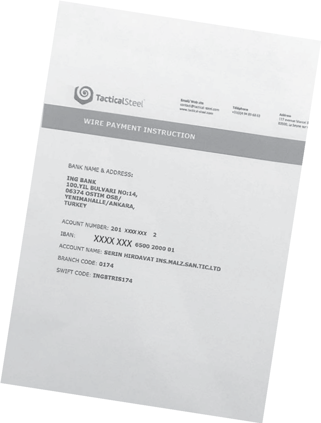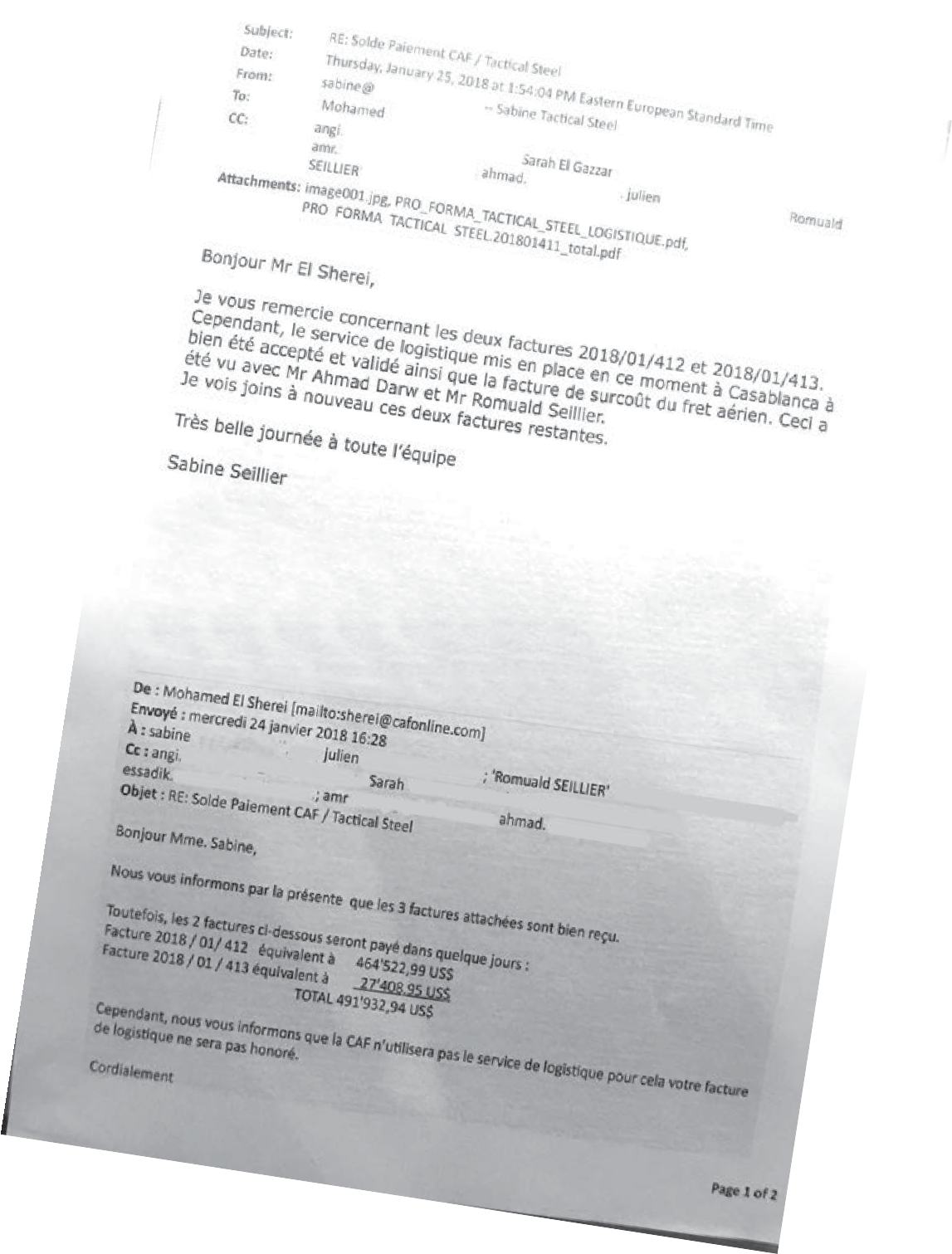 Ce n’est que le lendemain, que Sadek El Alaoui fait parvenir ce message à son supérieur, à savoir Amr Fahmy le secrétaire général de la CAF. Mais comme la commande a été passée dans l’urgence et que la CAF avait besoin que ces équipements arrivent au Maroc dans les plus brefs délais, Tactical Steel, dont les comptes bancaires sont gelés en France par le fisc pour audit, informe la CAF d’un surcoût par rapport au devis initial, un supplément qu’elle explique par le coût élevé du fret aérien. En bon client, la CAF accède à cette demande et ne voit pas non plus d’inconvénient à procéder au paiement de cette entreprise pourtant établie et immatriculée en France, via un intermédiaire en Turquie sur un compte de la Banque ING.