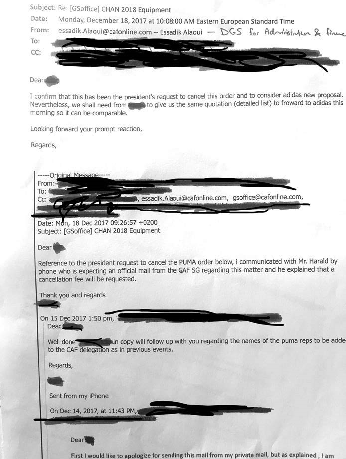 Nous sommes à la fin de l’année 2017, le CHAN 2018 initialement attribué au Kenya a été transféré au Maroc, puisque le Kenya qui organisait une élection présidentielle n’offrait plus toutes les garanties de stabilité et de sécurité aux yeux de la CAF. Pour cet événement, la CAF, par l’intermédiaire de son service marketing (a convenu avec la société PUMA de fournir aux joueurs les équipements nécessaires pour le CHAN qui s’est finalement déroulé au Royaume chérifien en 2018. Dans ce sens la CAF a saisi la firme allemande PUMA, le 12 décembre 2017 indiquant les équipements et produits sportifs requis. Nous sommes alors à quelques jours de Noël et PUMA fournit son devis. La marque allemande n’est bien évidemment pas seul sur le coup puisque d’autres fournisseurs tels que Adidas Egypt, Adi- das Germany et Nike, ont reçu le même appel d’offre, sans pour autant manifester de l’intérêt. Seule sur le marché PUMA a tout de même consenti une ristourne de 60% en répondant au cahier des charges de la CAF. Cette dernière accepte tout naturellement l’offre le 14 décembre 2017 et PUMA confirme sa disponibilité à livrer les équipement pour 312 000€.
