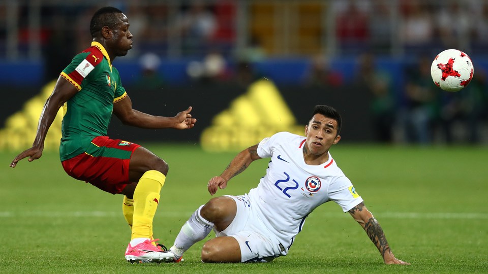 Le déferlement chilien a débuté très tôt dans la rencontre puisque dès la première minute, la défense camerounaise a dû se dégager en trombe. Puis, Vargas a mis une balle sur le poteau gauche du gardien Ondoa. Le même gardien va se signaler aux 4e, 25e et 27e minute face aux attaquants et milieu de terrain Chiliens Fuenzalida, Puch et Diaz.