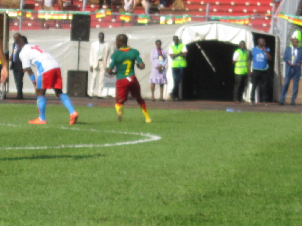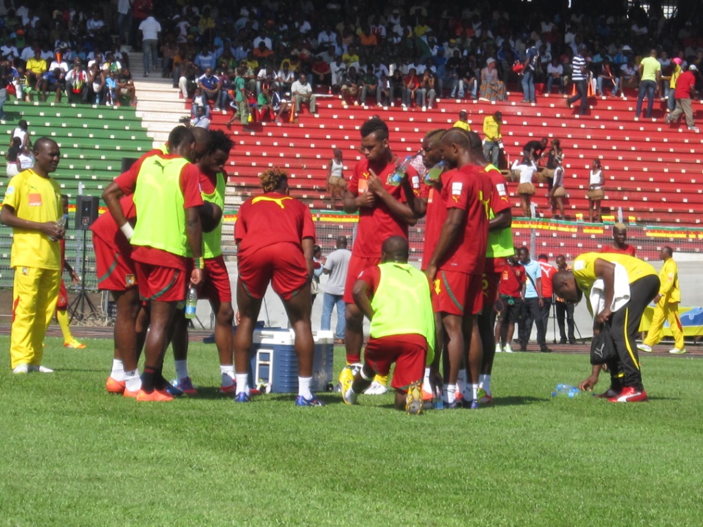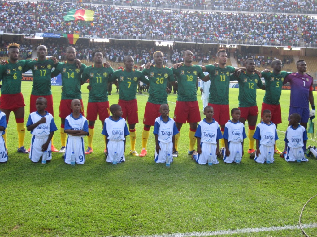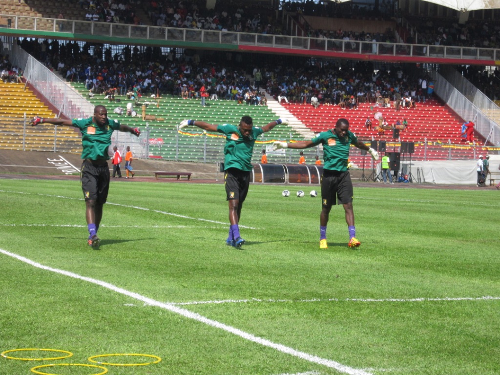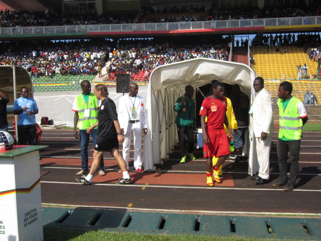 Le décor s’est définitivement planté au stade omnisports de Yaoundé. Les congolais sont habillés dans leur couleur traditionnelle, blanc-bleu-rouge. Les Lions Indomptables arborent leur accoutrement porte bonheur, le vert-rouge-jaune. Il faut noter que les deux sélectionneurs sont sortis ensemble, côte à côte, tous les deux habillés en noir.