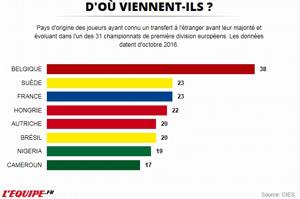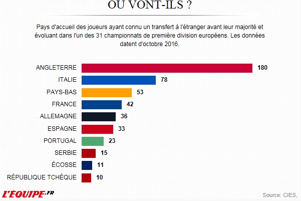 Le Cies constate d’une manière générale, que Le nombre des joueurs des cinq grands championnats européens, (Angleterre, Espagne, France, Allemagne et Italie) ayant quittés leur pays d’origine avant leur majorité a quadruplé en 20 ans, de 51 en 1995 à 195 en octobre 2016 (deux par club en moyenne). En 1995, 24,1% des footballeurs de ces championnats avaient déjà connu une expérience à l’étranger. En 2015, ce pourcentage passe à 55,2%. À l’échelle de 31 ligues européennes, la proportion des joueurs-migrants s’est aussi accrue de 46,3% en 2009 à 52,8% en 2016.
