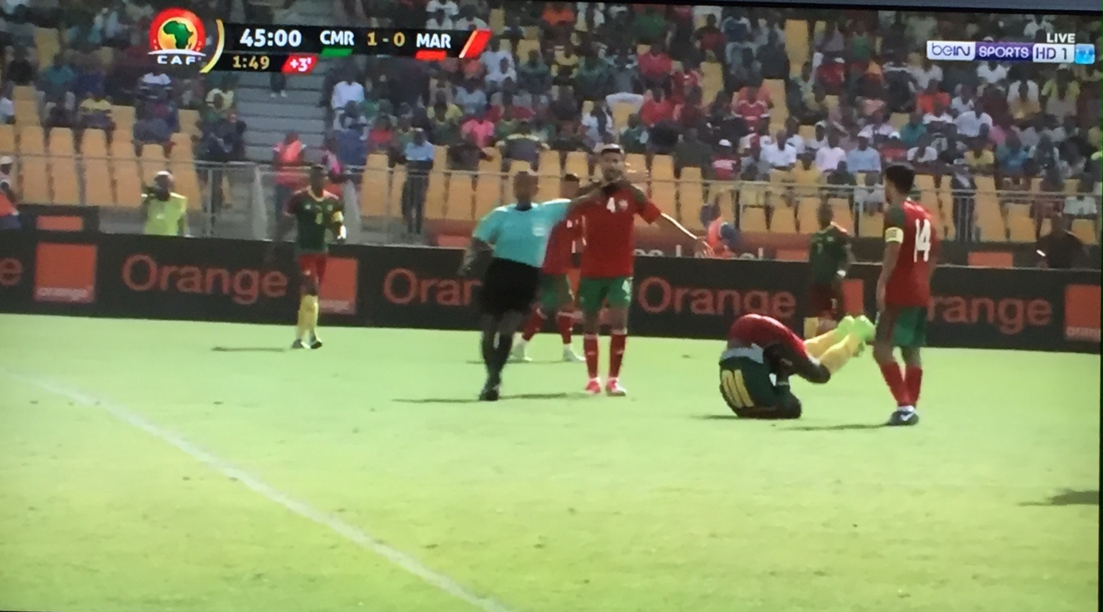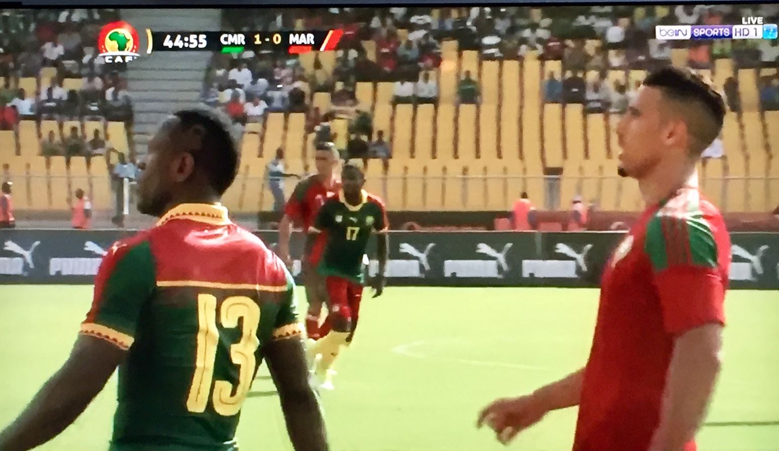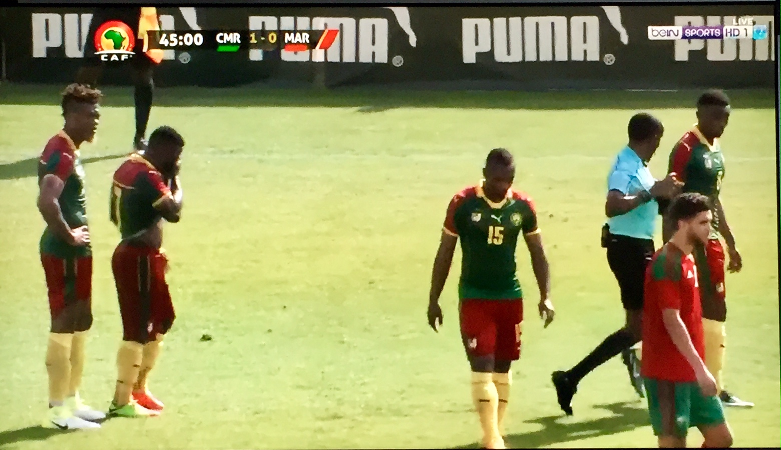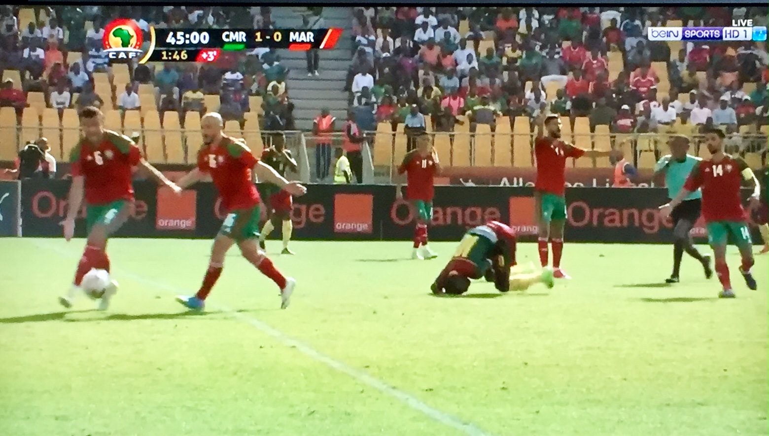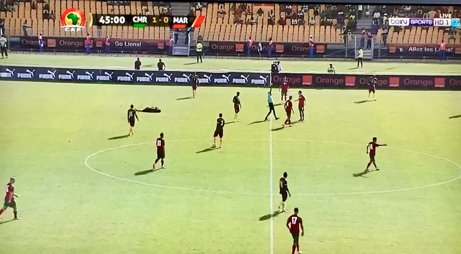 Aboubakar Vincent a donné l’avantage au Cameroun dans ce premier match des éliminatoires pour la Coupe d’Afrique des nations 2019. Les Lions indomptables, qui jouent devant leur public à Yaoundé, ont modifié le marquoir à la 28e minute. Les marocains sont d’une agressivité inégalée. Le latéral gauche Oyongo Bitolo a quitté le match victime d’un gros choc par ambulance. Il pourrait ne pas participer à la coupe des confédérations reste douteuse.