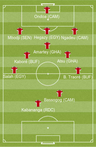 El Hadary (EGY), Kouyaté (SEN), Nakoulma (BUF), Bance (BUF), Moukandjo (CAM), Zezinho (GUB), Boussoufa (MAR)