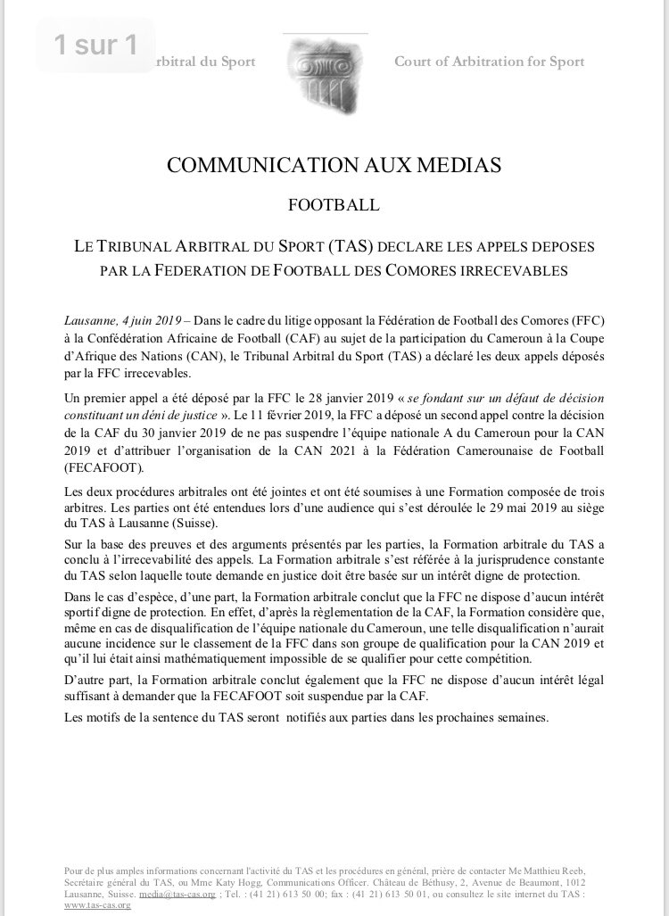 Les Lions Indomptables du Cameroun iront défendre leur trophée en Égypte. C’est la principale évidence qui se dégage du résumé de la sentence tel que prononcé par le Tribunal Arbitral du Sport ce mardi à Lausanne. La fédération Comorienne de Football a été déboutée des deux plaintes qu’elle avait déposé contre la Confédération Africaine de Football à l’effet d’abord de forcer l’institution à « respecter ses propres lois » et suspendre le Cameroun qui selon elle avait échoué dans l’organisation de la compétition, et d’autre part à forcer la substitution du Cameroun par les Comores à la phase finale de la CAN 2019.
