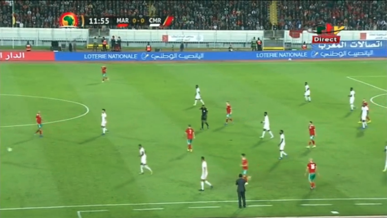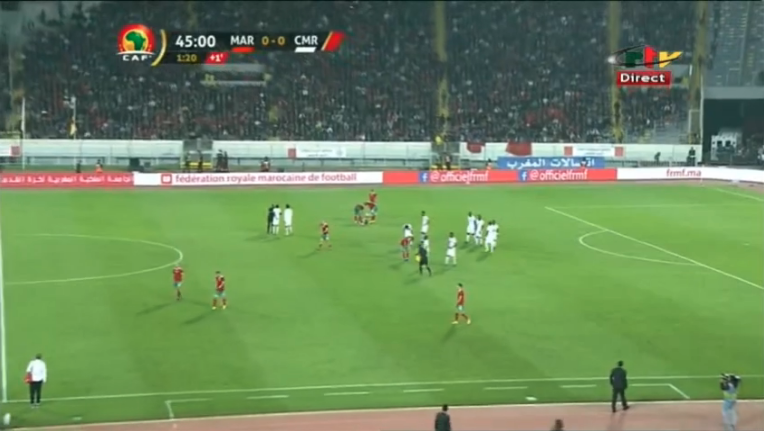 24e : Le Cameroun souffre. Les marocains monopolisent le ballon et appliquent une pression folle sur la défense camerounaise à la perte du ballon. Sur un coup franc joué à la droite de la ligne de la surface de réparation, la frappe est fortie des buts par le pied de Ngadeu.
