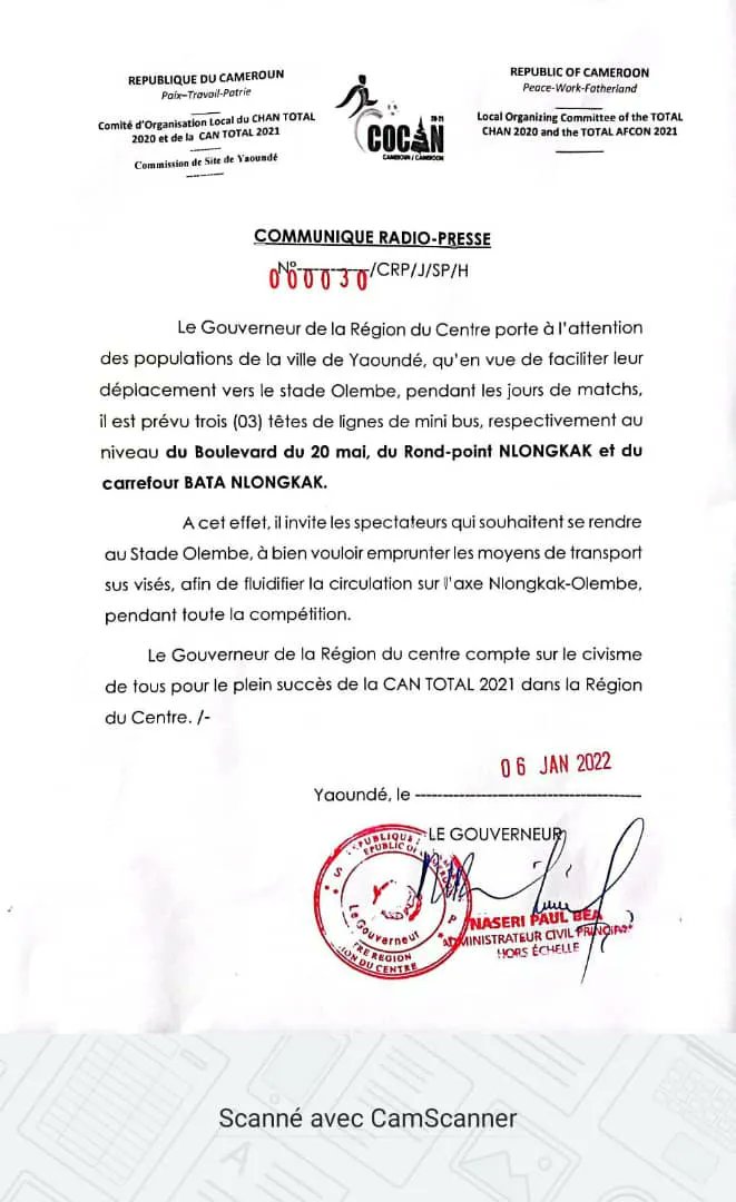 A moins de 48 heures du coup d’envoi de la Coupe d’Afrique des Nations (CAN) 2021, le gouverneur de la région du Centre du Cameroun, annoncé une décision qui va plaire aux supporters des Lions Indomptables.