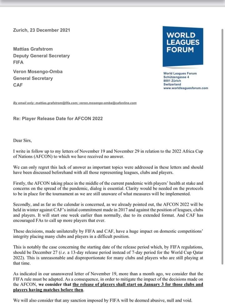Frustrée de n’avoir pas reçu de réponse à ses deux lettres du 19 et 29 novembre, l’Association Mondiale des Leagues a décidé de défier la CAF et la FIFA. Dans une correspondance dont Camfoot a reçu copie, elle déploie les arguments qui motivent son écœurement. D’abord la CAN se tient en pleine pandémie, et ensuite, la décision de ramener la compétition en janvier ne passe pas.