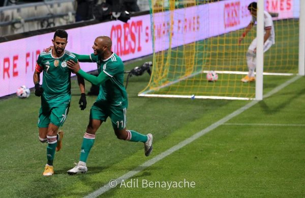 Tout avait bien commencé pour les algériens qui ont réussi à neutraliser l’adversaire qui ne s’est pas procuré d’occasion et ce sont les joueurs de Belmadi qui vont obtenir plusieurs coup-francs dangereux mais assez mal négociés. Il faut attendre la demi-heure de jeu pour voir l’ouverture du score par Andy Delort qui place une tête puissance sur un très bon centre de Reda Halaimia (34′). Dans la foulée, Saïd Benrahma remonte une balle sur le côté gauche, entre dans l’axe et envoie une transversale vers Mahrez qui devance de peu son vis à vis avant de le dévorer d’un contrôle en aile de pigeon pour filer vers la surface et humilier le pauvre Chicksen puis aligner le gardien (38′).