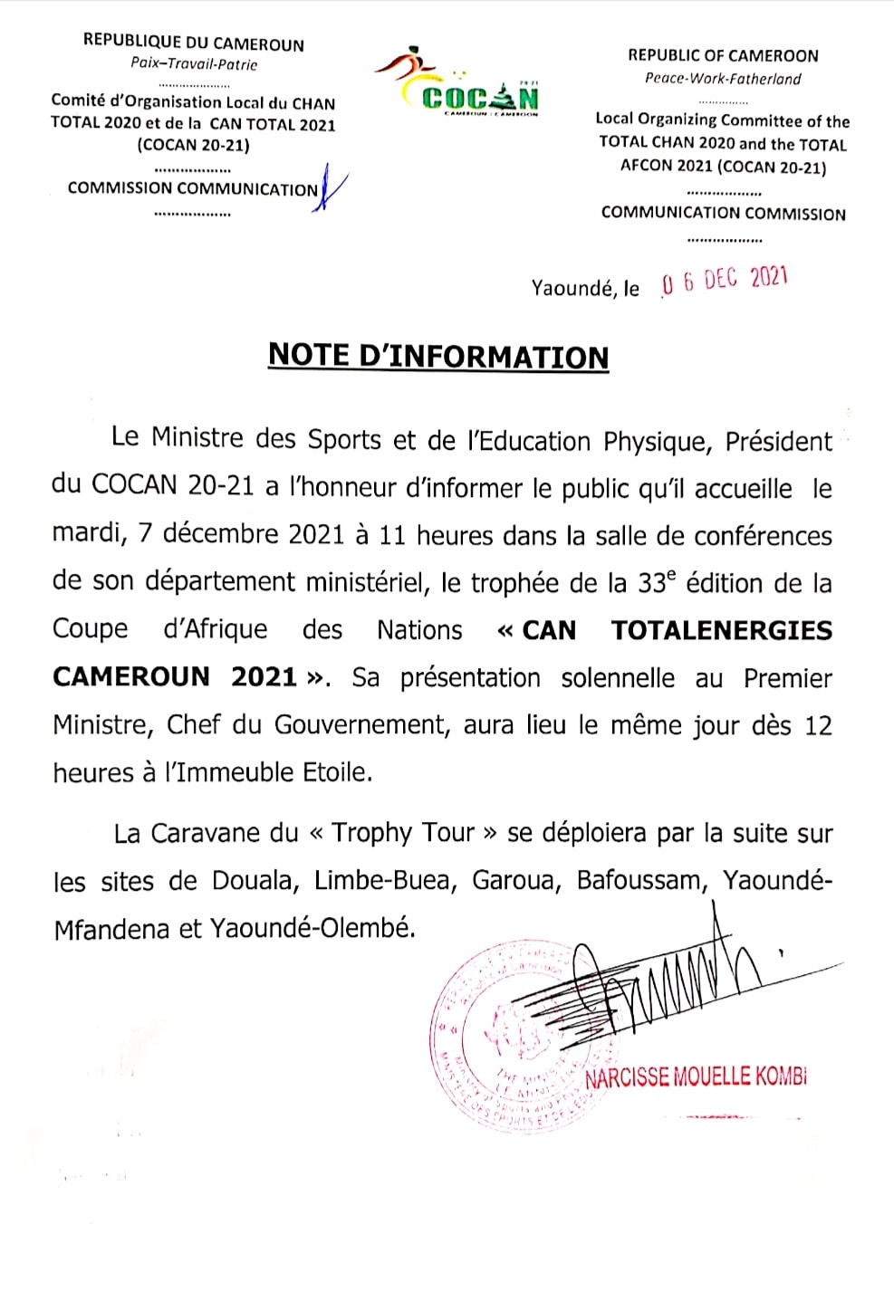 Ce lundi, le trophée qui sera remis au prochain vainqueur de la Coupe d’Afrique des Nations est arrivé à Yaoundé. Si certains estiment que c’est la preuve que le tournoi ne sera désormais plus être retiré au Cameroun, le ministre des sports a publié un communiqué faisant état de la réception officielle de ce symbole fort de l’amitié entre les peuples africains.