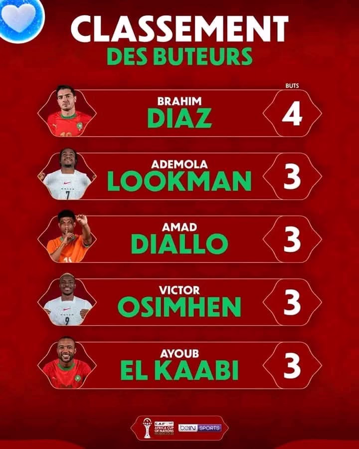 Brahim Díaz fait la course en tête des meilleurs buteurs de cette édition. L’ailier du Réal Madrid compte 4 buts jusqu’ici en quatre matchs. Il est à une longueur du meilleur buteur de l’édition précédente en Côte d’Ivoire. En dehors de Brahim Díaz, plusieurs joueurs sont à trois buts. On peut citer entre autres : Ademola Lookman, Amad Diallo, Victor Osimhen, Ayoub El Kaabi. Il complète le top 5.