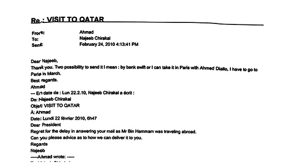 Que leur promet Bin Hammam ? Certainement des douceurs car, à partir de cette date, le Qatari est inondé de mails provenant, entre autres, du Bénin, du Botswana, du Burundi, des Comores, de la Côte d’Ivoire, de Djibouti, de la Gambie, de la Guinée, du Liberia, de Madagascar, du Maroc, de la Namibie, de São Tomé-et-Príncipe, de la Somalie, du Soudan, du Swaziland, du Togo et de la Zambie.