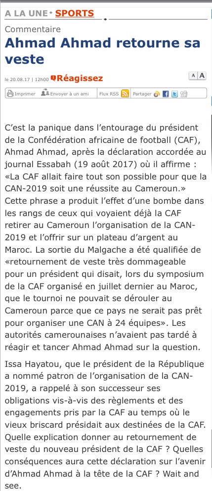 Avec les développements sans cesse mouvants dans ce dossier, la partie Marocaine et ceux qui ‘ont porté au pouvoir ne cessent de mettre de la pression dur Ahmad pour qu’il tienne ses promesses. Il y a d’ailleurs eu un fort mouvement de panique la semaine dernière lorsque Ahmad Ahmad a déclaré à un journal malgache, peut-être pour mettre se donner du répit après ses déclarations en Guinée, qu’il compte réussir l’organisation de sa première CAN au Cameroun. Le journal El-Watan de l’Algérie, a donc cru bon de continuer à lui mettre la pression pour qu’il tienne les engagements pris lors du Symposium du Maroc.